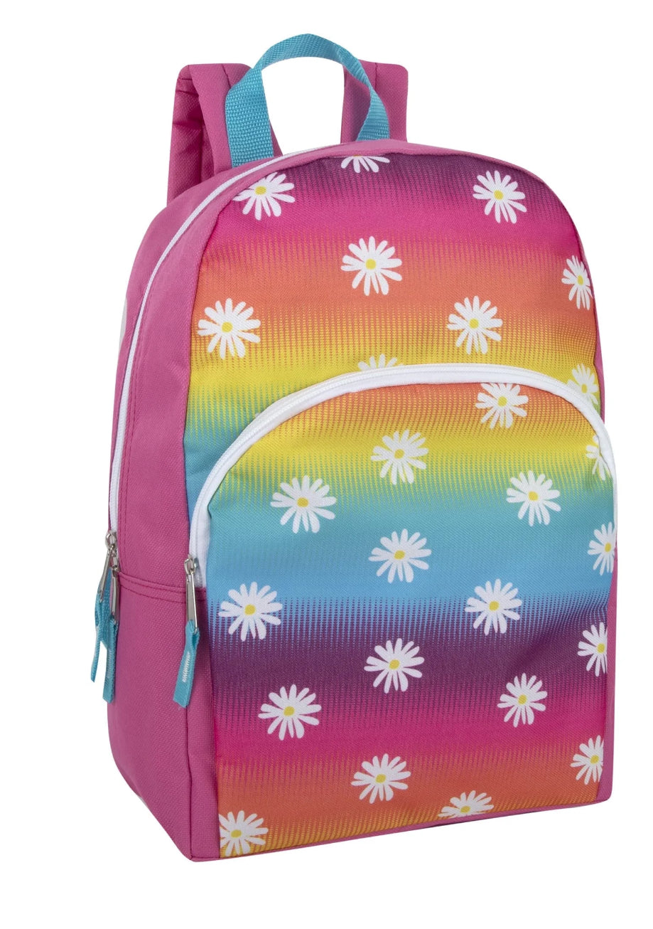 15 Inch Fun Printed Backpack with Front Zippered Pockets in Dancing Rainbow Daisies
