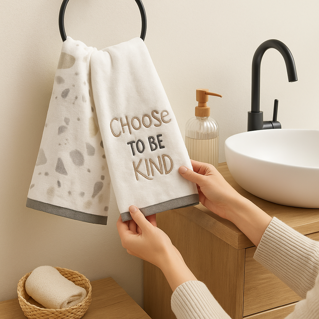 Add a gentle reminder of kindness to your home with this beautifully embroidered towel set. Featuring one towel with the uplifting message “Choose to Be Kind” and one with a soft neutral terrazzo pattern, this set brings both style and heart to your bathroom or kitchen. Crafted from 100% cotton velour, they offer a soft, plush texture perfect for everyday use.