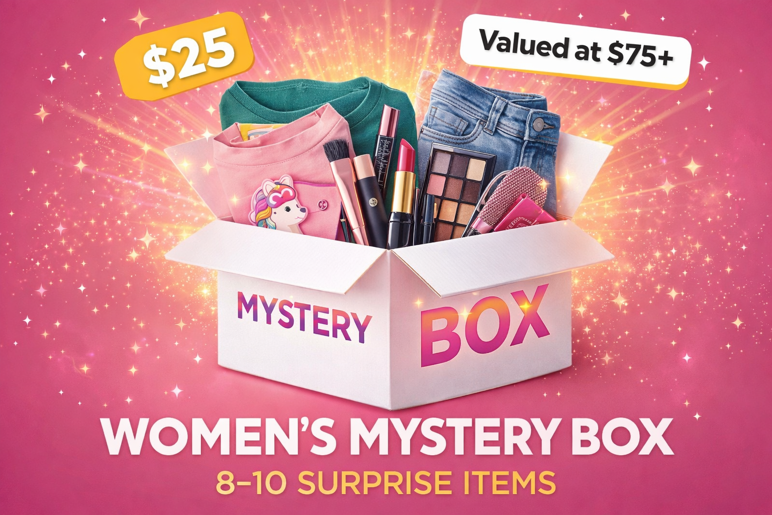Surprise yourself with our Women’s Mystery Box, thoughtfully curated to bring you style, beauty, and fun in one box!
